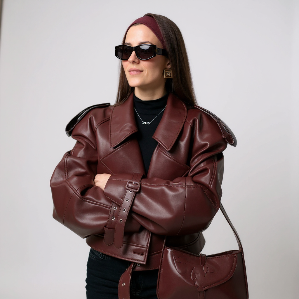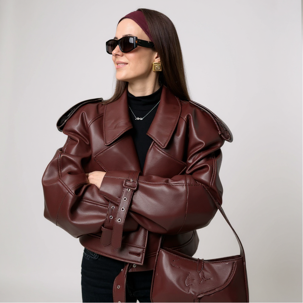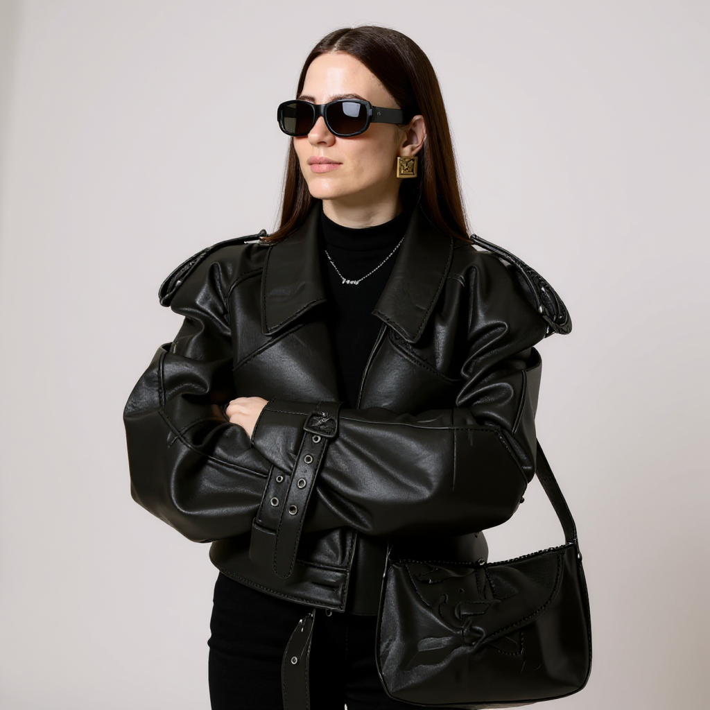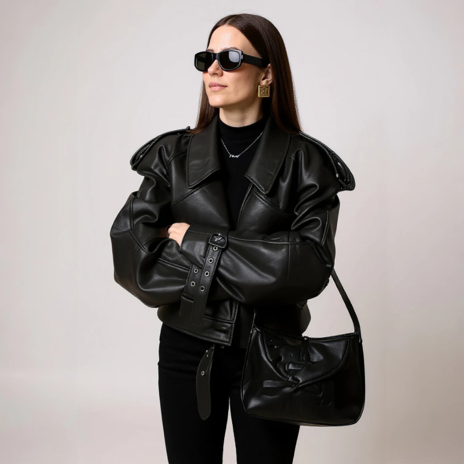 Sinta a textura premium do couro e o design com ombros estruturados que transforma qualquer look básico em uma produção de alta moda. Perfeita para dominar a reunião de negócios ou para ser o ponto alto do seu look noturno. É a definição de presença marcante.