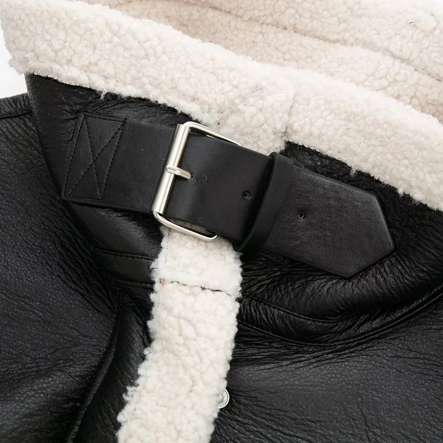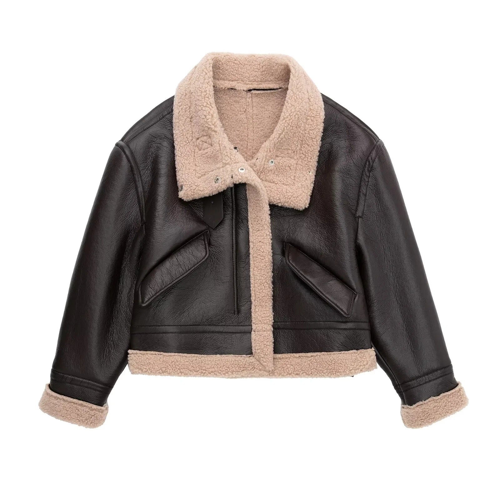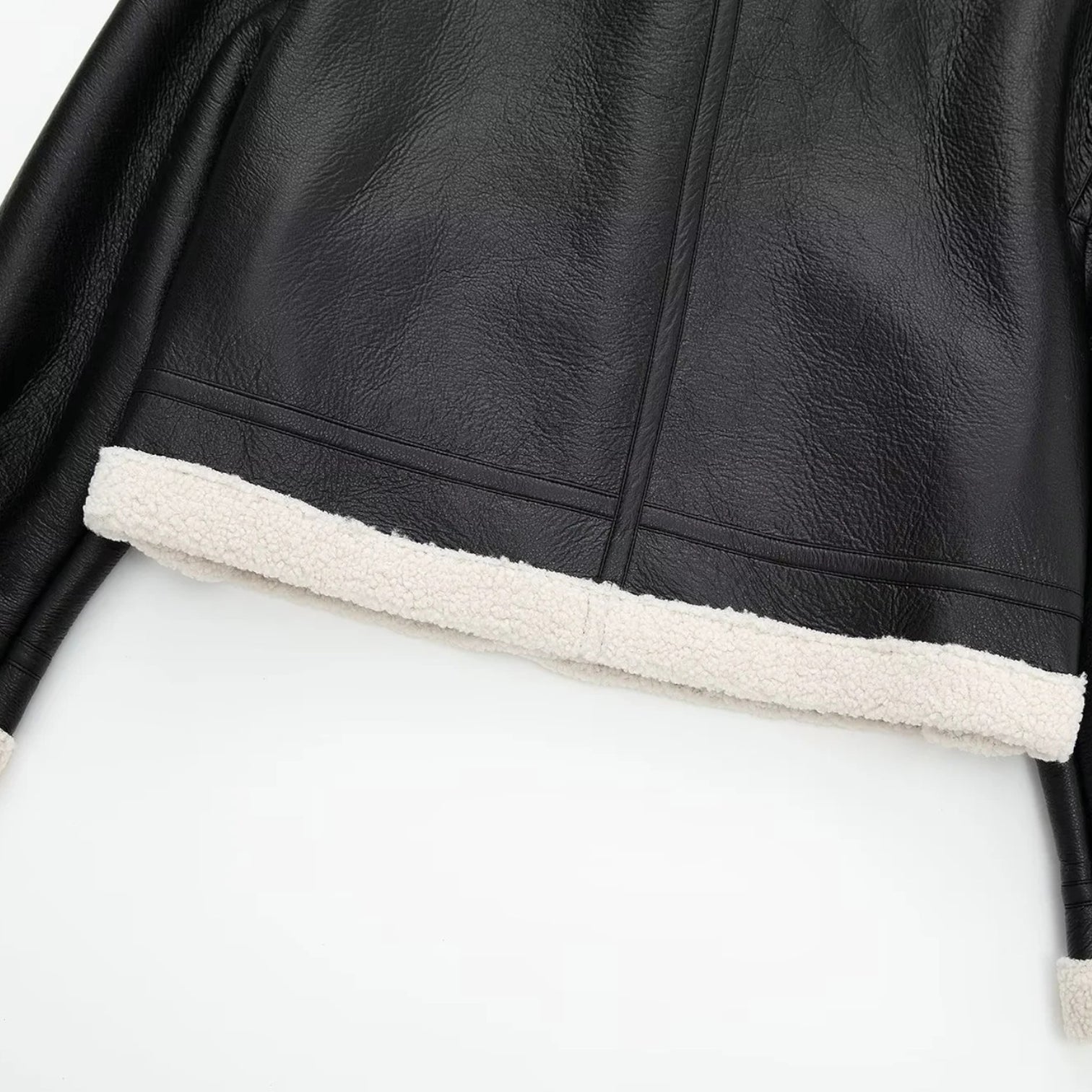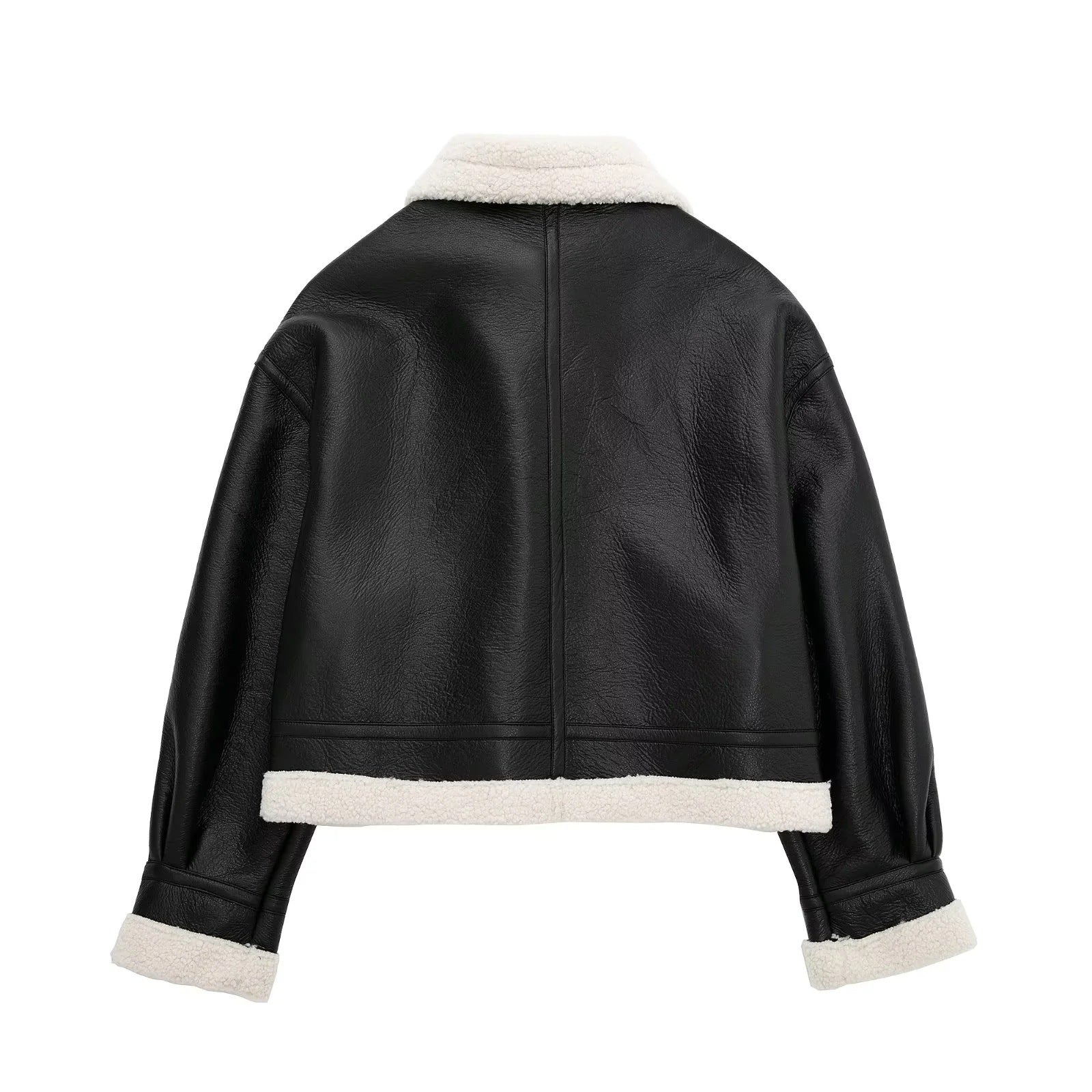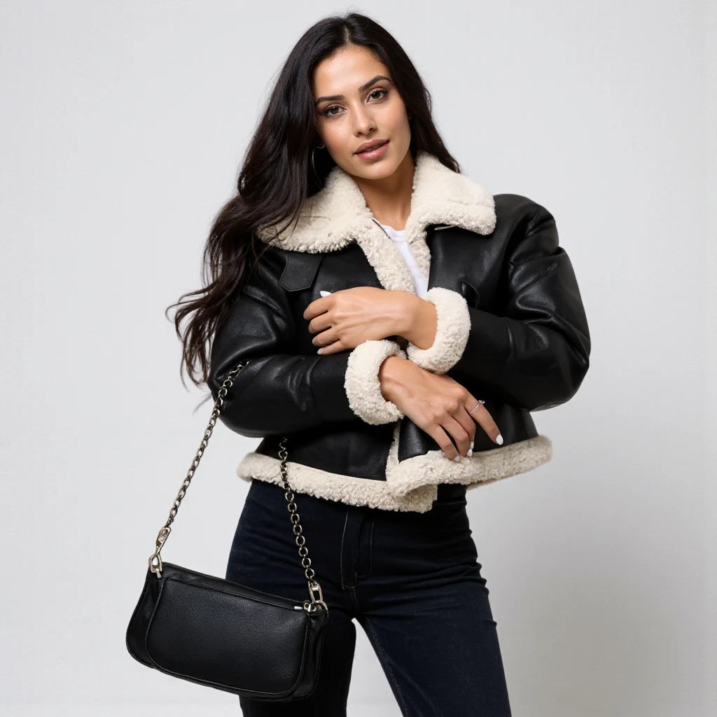 Sinta o toque ultra-macio do forro de lã (shearling) que te mantém aquecida, enquanto o exterior em couro (PU) bloqueia o vento. Perfeita para um look de impacto no dia a dia ou para uma viagem de inverno, ela é a definição de conforto luxuoso.